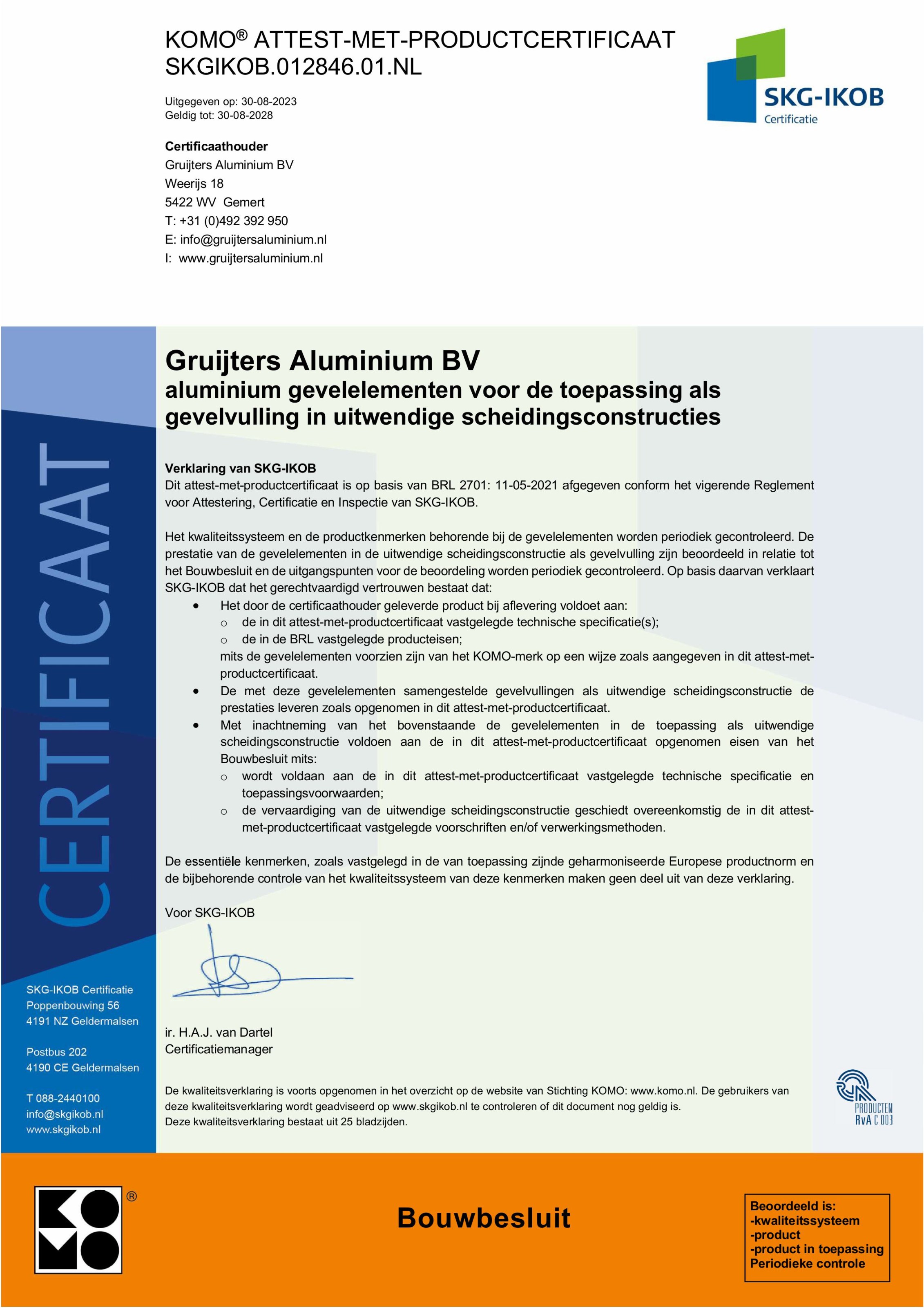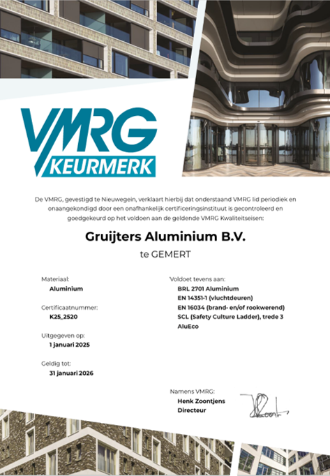 Het VMRG Keurmerk is een initiatief van de VMRG, de branchevereniging voor gevels en gevelelementen. Bedrijven met dit keurmerk beschikken over hoogwaardige kennis en expertise op het gebied van metalen gevels en gevelelementen en plaatsen en monteren die op de juiste wijze. Deze bedrijven leveren producten die voldoen aan de VMRG Kwaliteitseisen en Adviezen: de strengste eisen op het gebied van kwaliteit, veiligheid, comfort en duurzaamheid. VMRG leden ondergaan jaarlijks onafhankelijke controles door SKG-IKOB Certificatie. Zie onderstaand certificaat.