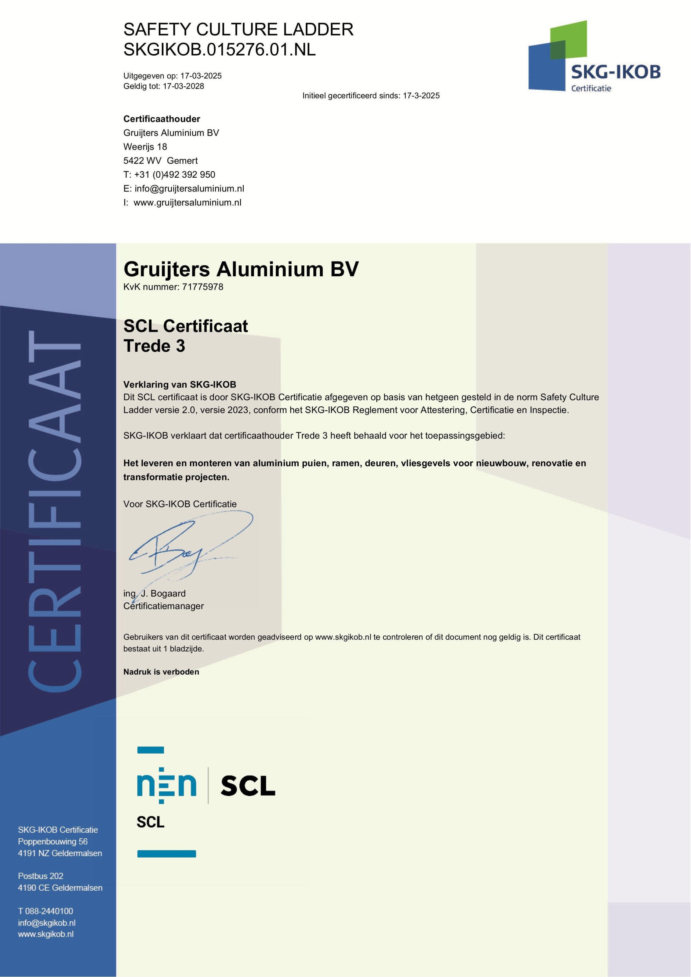 SKG-IKOB is dé Nederlandse certificatie-instelling voor de bouw- en vastgoedsector. SKG-IKOB werkt voor producenten, leveranciers, uitvoerders en dienstverleners in de bouw en de gebouwde omgeving die zich aantoonbaar willen onderscheiden met een certificaat, keurmerk of label. Hiervoor leveren zij een totaalpakket op het gebied van kwaliteit door het testen en certificeren van ontwerpen (attesten), producten, processen, diensten en managementsystemen. Op basis van ruim 50 jaar ervaring biedt SKG-IKOB 'one-stop-shopping' Zij werken klantgericht, betrouwbaar en modern. Zij streven naar duurzame klantrelaties.