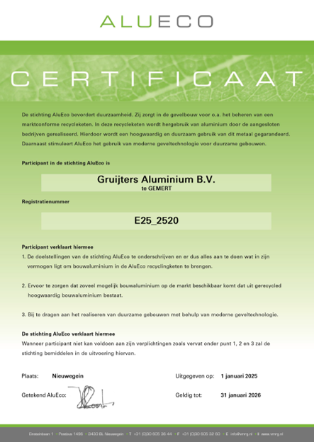 De stichting AluEco bevordert duurzaamheid. Zij zorgt in de gevelbouw voor o.a. het beheren van een marktconforme recycleketen. In deze recycleketen wordt hergebruik van aluminium door de aangesloten bedrijven gerealiseerd. Hierdoor wordt een hoogwaardig en duurzaam gebruik van dit metaal gegarandeerd. Daarnaast stimuleert AluEco het gebruik van moderne geveltechnologie voor duurzame gebouwen.